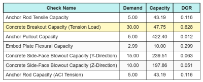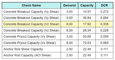 When checking the anchor rod capacity under combined shear and tension loads using ACI, a different approach is applied. For completeness, we also perform the ACI interaction checks in this calculation, which include other concrete interaction checks as well.