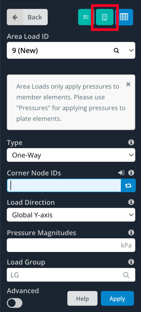 To use the integrated Load Generator, finish modeling your structure, then go to Area Loads on the left input tab while operating in Structural 3D. Then, click on the red auto generate load button.