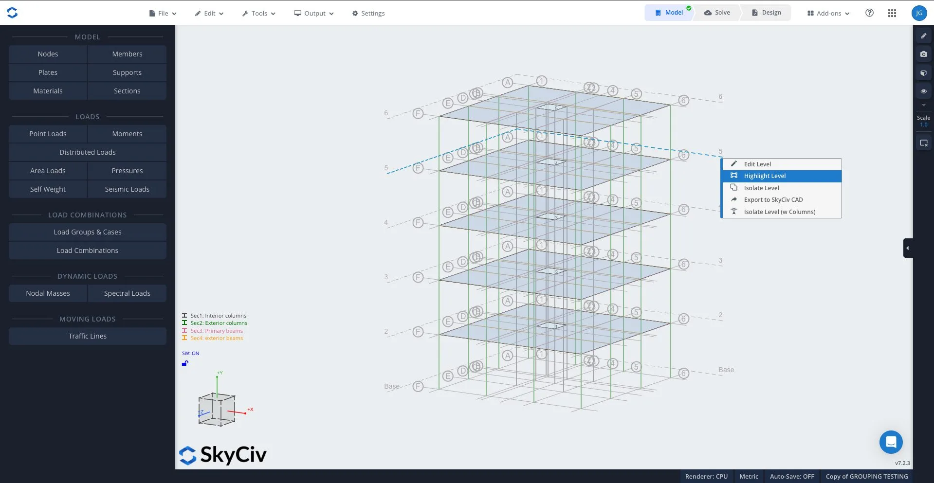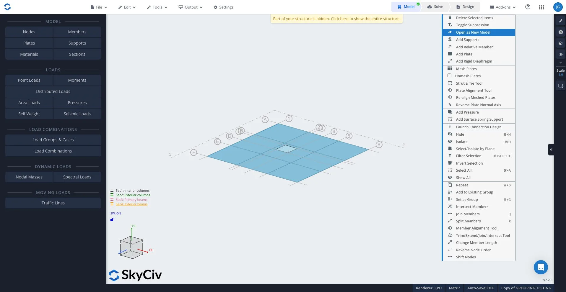 For multi-story structures, elevations are a more structured way to isolate desired regions. Using Gridlines and elevations tool, a specific floor level can be selected or isolated and once highlighted (desired region will appear blue) right click and select “Open as New Model” to extract level into seperate model.