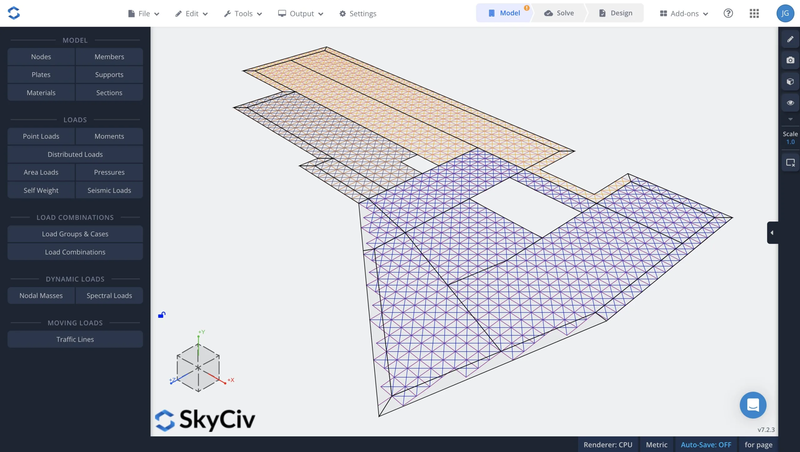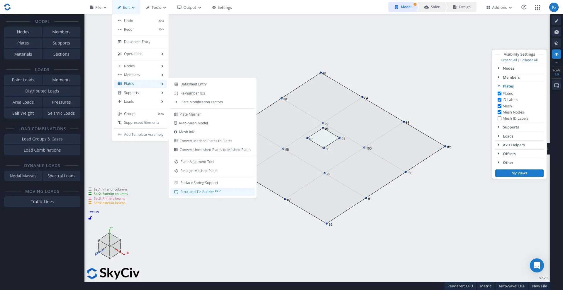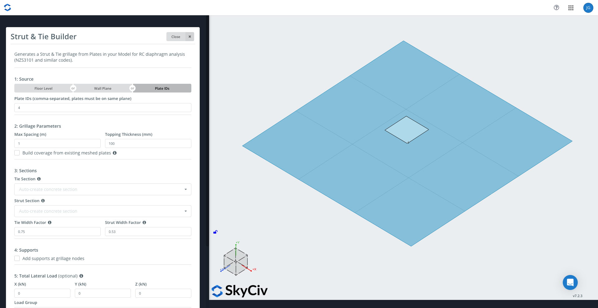 Skycivs strut-and-tie builder operates directly from plate elements, meaning a valid plate model must exist before the tool can be used. The diaphragm region must be defined using plates, as plate geometry forms the basis of generated grillage.