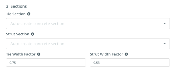 When tie and strut section are left blank the tool generates member properties from grid spacing plate thickness or topping thickness and default width factors. Members properties are defined by: