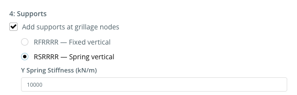 Supports can automatically be added automatically assigned to nodes where grillage members intersect. Two main support types can be applied