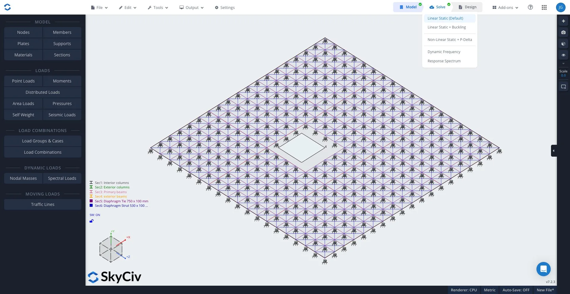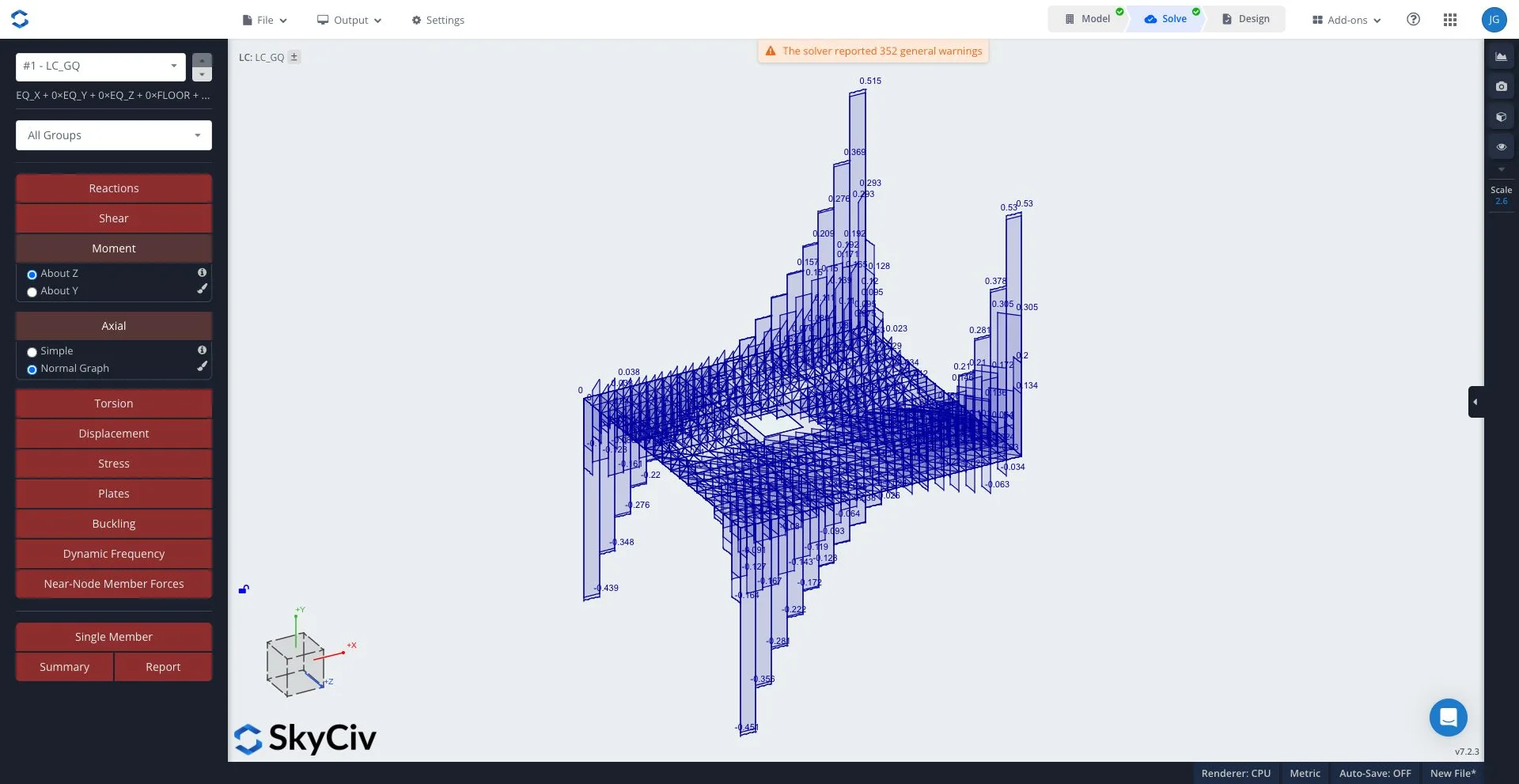 After solving, results can be reviewed to validate the behaviour of the generated system. Key outputs include axial forces, displacements, and stress distribution within the members. These results can be visualised directly in the graphical interface or exported as CSV files or PDF analysis reports.