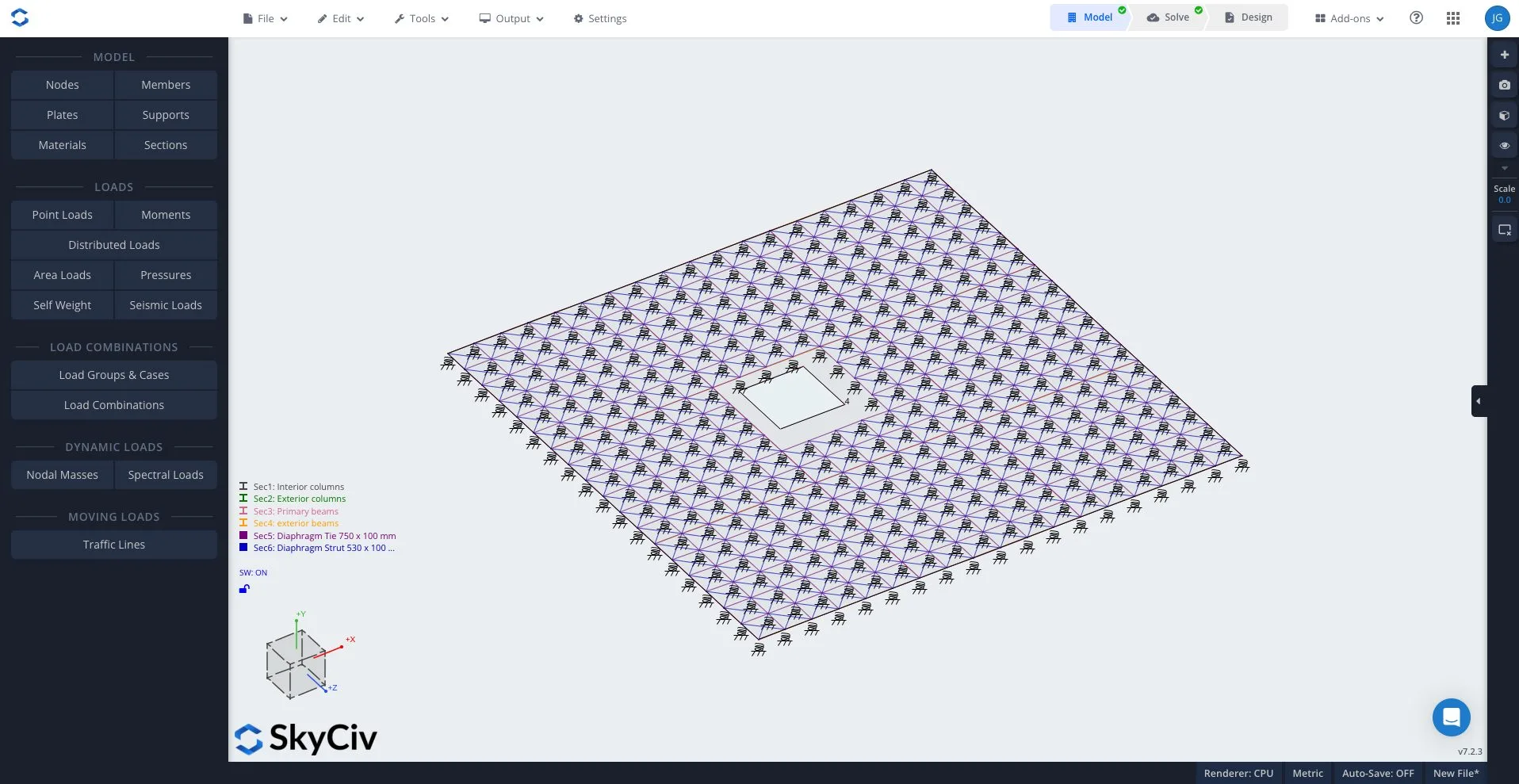 This can be done by going to the top right of the page, selecting solve and allowing the solver to run. Once complete, results are now ready to be reviewed to confirm system is working as an intended strut-and-tie model.