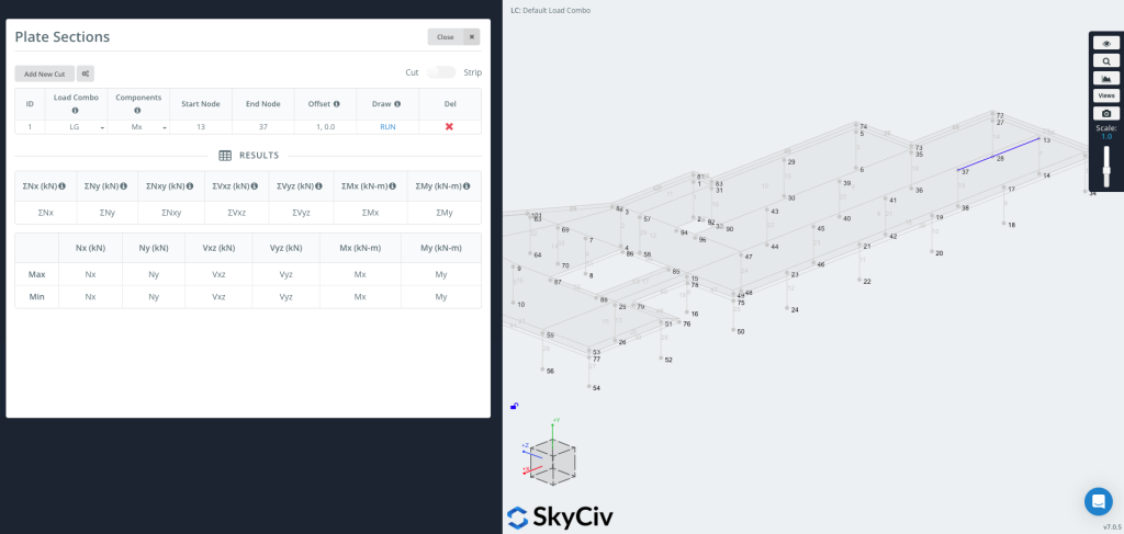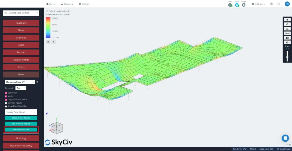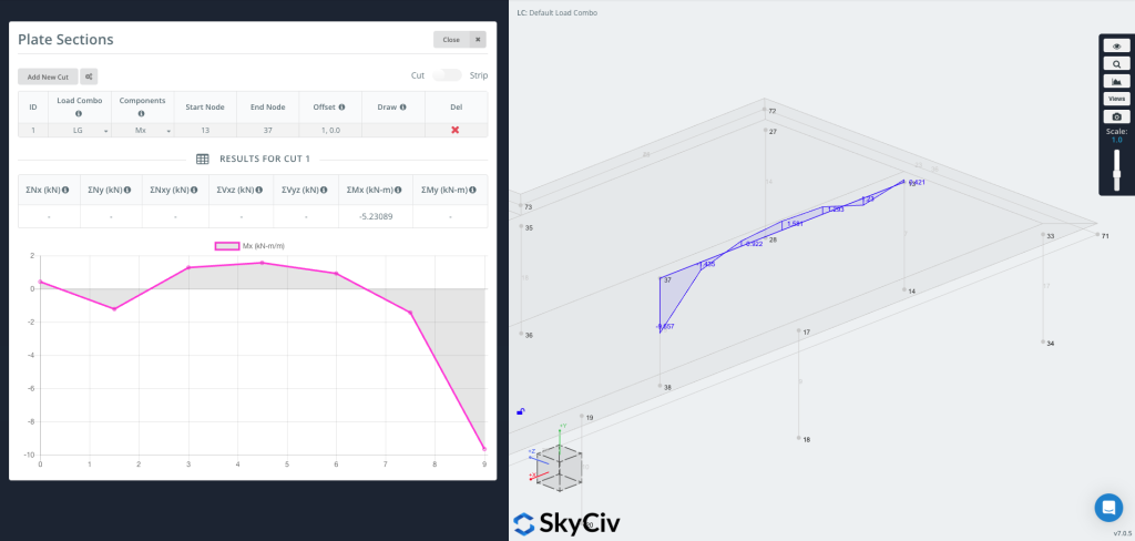 ο Περικοπές τμήματος πλάκας tool allows you to extract forces, στιγμές, and other plate results along any defined cut line across slabs, πλάκες, or walls. This is useful for slab strip design, checking local plate behaviour, and verifying load distribution.