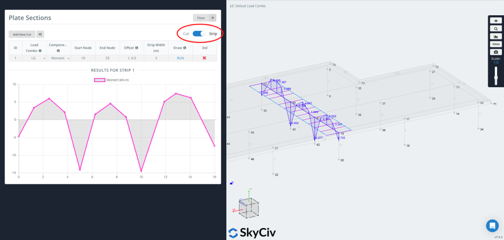 ΕΝΑ Strip extracts results over a width, not just a line. It averages the plate results across an effective width centred on the defined cut line—this is typically used for slab strip design, where design codes require moments to be averaged across a strip of slab.