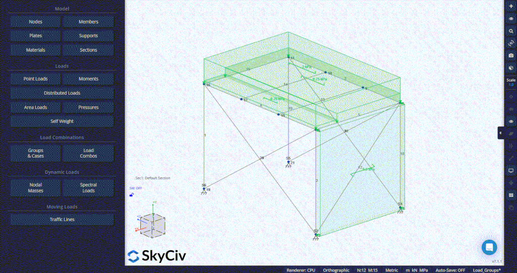 Après avoir fini de modéliser votre structure, vous voudrez lui appliquer des charges. Faire cela, sélectionnez les types de charge appropriés dans le menu de gauche (sous la rubrique Charges) et remplissez les champs obligatoires. Pour permettre aux utilisateurs de démarrer rapidement, S3D preloads every new model with the LG groupe de charge. Si vous souhaitez obtenir des résultats rapides, vous pouvez simplement ajouter toutes vos charges sous le LG chargez le groupe et appuyez sur le bouton de résolution en haut de l'écran.