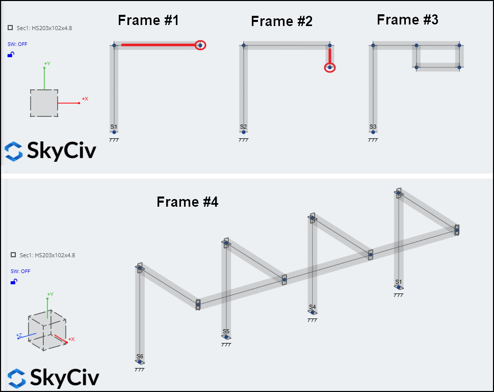 - Telaio 1: Solo la trave orizzontale viene rilevata automaticamente come sbalzo, anche se alcuni potrebbero obiettare che anche la colonna si comporta come tale.
