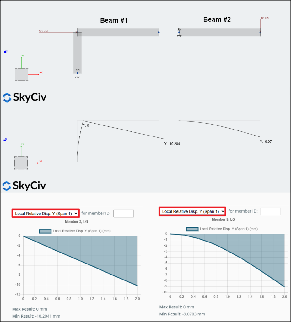 - Fascio #2: SkyCiv corrisponde al comportamento teorico. La flessione interna dell'elemento produce uno spostamento della punta di 9.07 mm, che è lo stesso sia per il valore relativo che per quello assoluto.