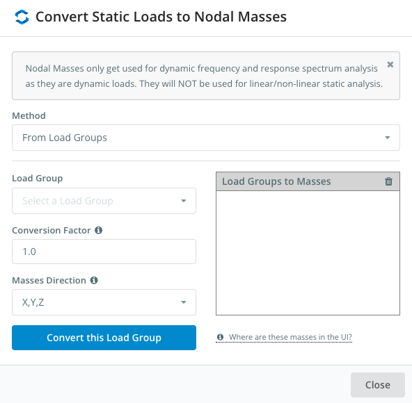 Ciò consente agli utenti di aggiungere gruppi di carico e convertirli in masse modali, dando all'utente il pieno controllo di quali carichi sono inclusi, con controlli per direzioni e fattori di massa.