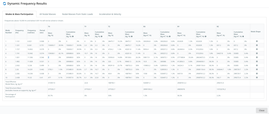 Inoltre, i risultati della partecipazione di massa modale di una struttura, e le sue modalità possono essere riviste facendo clic su Partecipazione di massa tab. Il fattore di partecipazione di massa rappresenta la quantità di massa associata alla specifica frequenza o modalità di vibrazione. Essenzialmente consente all'utente di vedere quanta parte della massa della struttura è eccitata con la modalità data. Dando così spunti sulla risposta della struttura: maggiore è il fattore di partecipazione di massa, maggiore è il suo significato per la risposta complessiva.