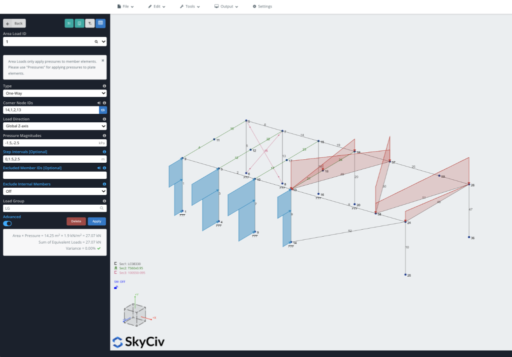 面積荷重を適用する最後の方法は、オープン構造の面積荷重です。. 聞こえるように、Open Structure Area Loadsは、オープン構造またはそのメンバーが外部要素に直接影響を受ける構造に適用されることを意図しています. この方法で, 構造3Dは、セクションの支流幅に基づいて等価分布荷重を計算します, 負荷に対する向きによって異なります. セクションの露出領域が広くなるにつれて, 同等の分布荷重は、同じ一定のオープン構造領域荷重に対して増加します. 柱風荷重法と同様, これは、最も一般的には風荷重と組み合わせて使用されます. 風荷重の計算は、 SkyCiv風設計ソフトウェア