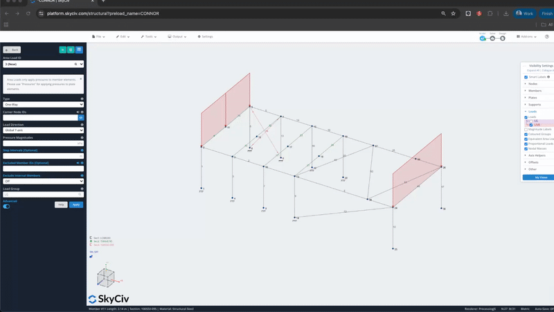 エリア荷重が作成され、エリアに適用されるとき, それらは元々立方体の形として表示されます, 一定の圧力を示します. 解析で実際に使用されるのは、メンバーに適用される同等の分散荷重です。. 面積荷重の種類に応じて, これらの分布荷重はさまざまな要因に依存しますが、主にエリア荷重内にあるメンバーの支流の幅/間隔に依存します. これらの同等の分散負荷は、表示スペースでオンとオフを切り替えることができます.