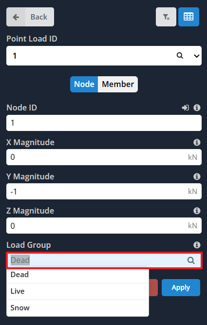 Nadat u klaar bent met het modelleren van uw structuur, je zult er belastingen op willen toepassen. Om dit te doen, selecteer de juiste belastingstypen in het menu aan de linkerkant (onder het kopje Ladingen) en vul de verplichte velden in. Om gebruikers snel aan de slag te laten gaan, S3D laadt elk nieuw model vooraf met de LG-belastingsgroep. Als je snel resultaat wilt behalen, u kunt eenvoudig al uw belastingen onder de LG-belastingsgroep toevoegen en op de knop Oplossen bovenaan het scherm klikken.