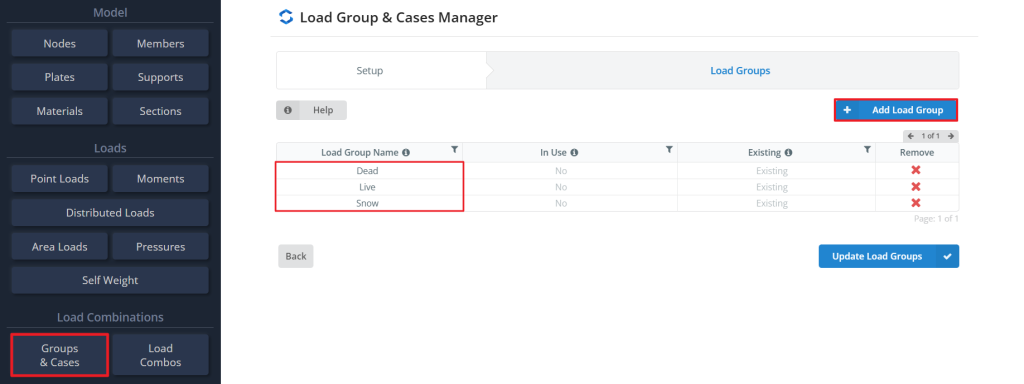 Als u meer dan één laadgroep heeft, U kunt handmatig belastingscombinaties maken. Om dit te doen, selecteer Combo's laden in het menu aan de linkerkant, voer de coëfficiënten in voor elke belastingsgroep en klik op Toepassen om de belastingscombinatie in te dienen.