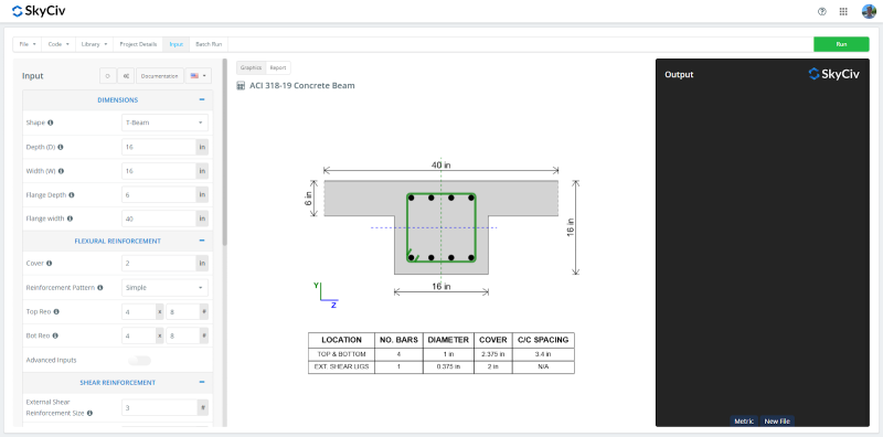 The latest addition to the SkyCiv Quick Design module, the ACI 318-19 Concrete Beam Design, allows users to design rectangular and T-beams in accordance with ACI 318-19 for axial, bending, and shear loading. It also verifies reinforcement spacing, ratio requirements, and concrete cover compliance per ACI 318-19, Chapter 9.