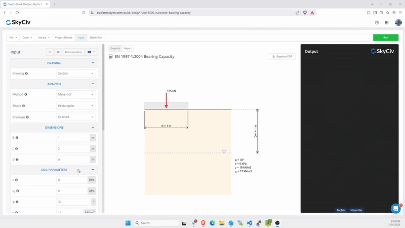 - Extensive Design Methods Support: Allows for calculations with Terzaghi, Hansen, Vesic and Meyerhoff methods.