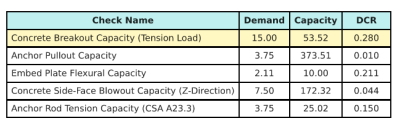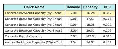 Ao verificar a capacidade da haste de ancoragem sob cargas combinadas de cisalhamento e tensão usando CSA A23.3, uma abordagem diferente é aplicada. Para completar, também realizamos o CSA A23.3 interaction checks neste cálculo, que incluem outros verificações de interação concreta também.