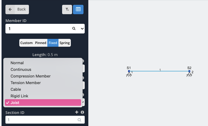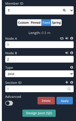 查找您要设计的成员, 然后打开“高级’ 设定. 更改成员的“类型’ 成为“ Joist’ 然后点击“应用”. 一些领域将被合并 (例如末端固定装置)