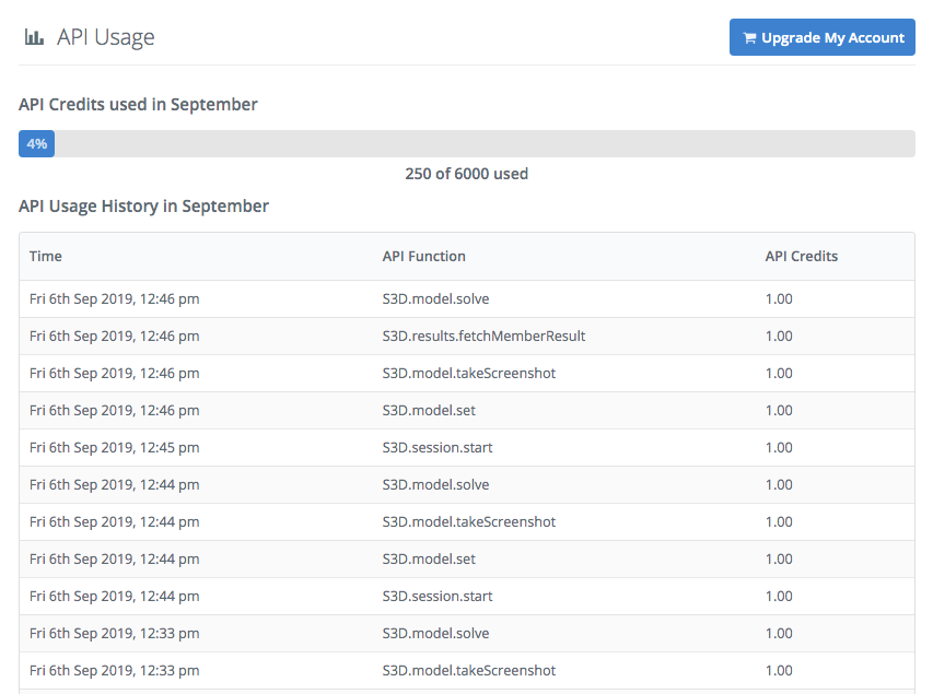 Every SkyCiv user has a maximum number of API credits available, based on their account level. Users can check their usage at any time by visiting their account activity page.